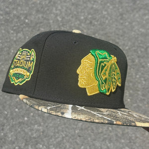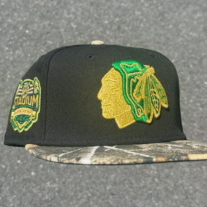 Chicago Blackhawks Real Tree Camo 2014 Stadium Series Side Patch NHL Fitted Hat New Era 5950 (Black/Real Tree Camo/Gold/Green)