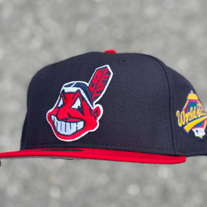 Cleveland Indians Chief Wahoo Banned logo 1997 World Series Fitted with patch on opposite side(Navy Blue/Red/Grey) + Free Pin